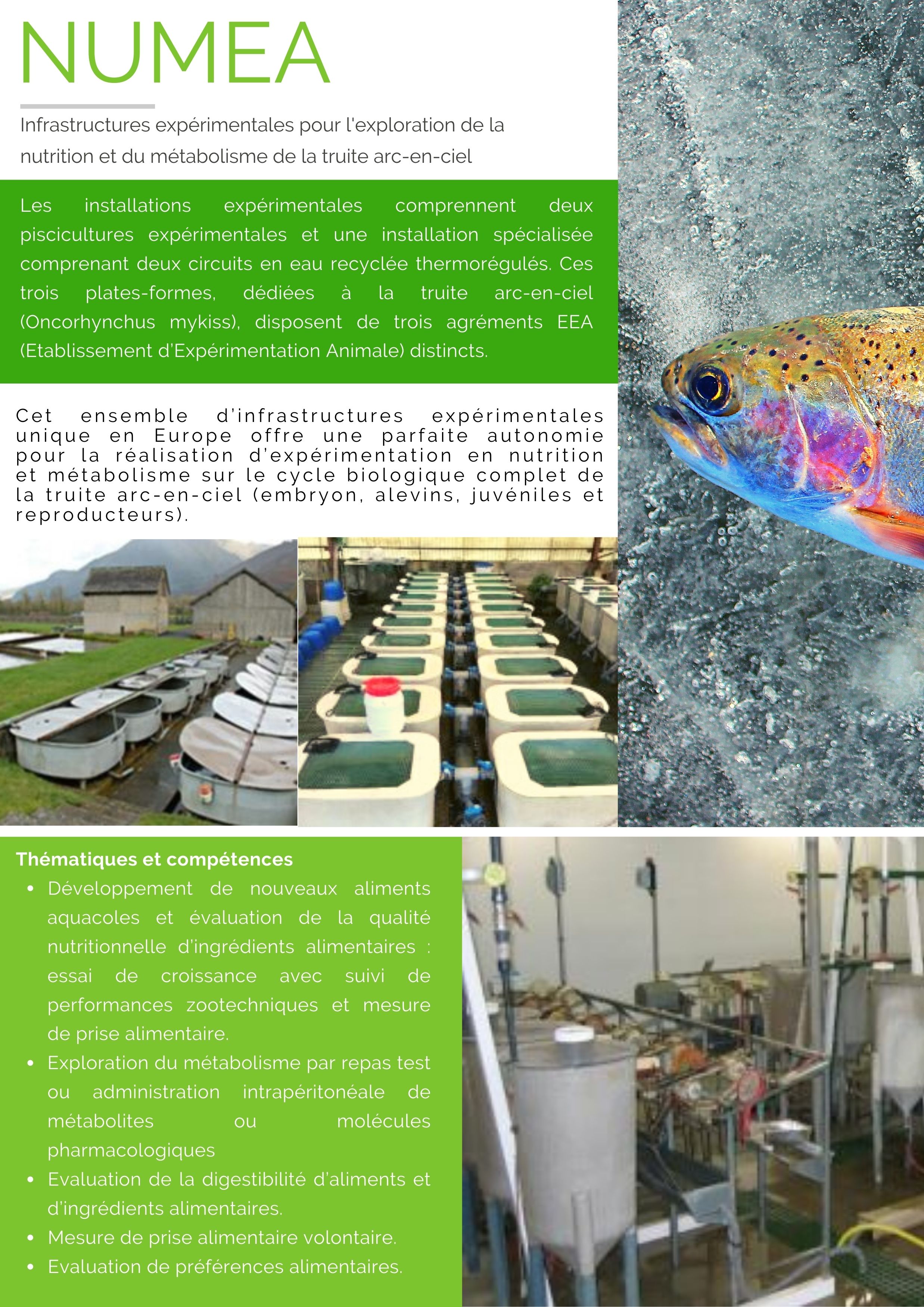 Les installations expérimentales comprennent deux piscicultures expérimentales et une installation spécialisée comprenant deux circuits en eau recyclée thermorégulés. Ces trois plates-formes, dédiées à la truite arc-en-ciel (Oncorhynchus mykiss), disposent de trois agréments EEA (Etablissement d’Expérimentation Animale) distincts.